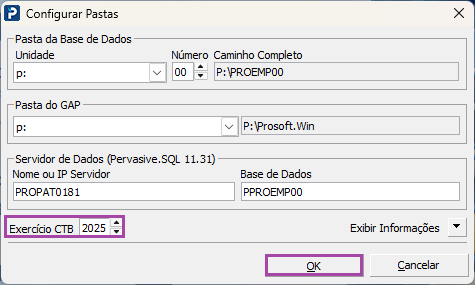 1- Acesse o módulo Contábil clique em F3 do teclado e altere o ano de Exercício CTB para o ano de movimento das notas fiscais que serão integradas.