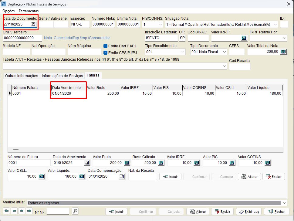 2- Verifique que a data da escrituração é em 2025, mas a fatura está com a data de 2026