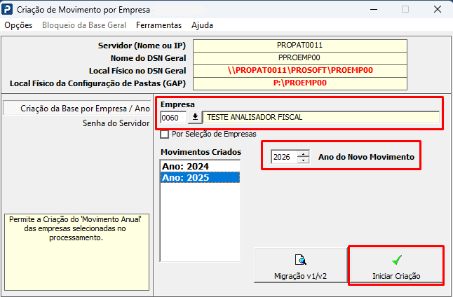 Acesse: FIscal > Rotinas auxiliares > Criação de movimento por empresa e crie o movimento de 2026