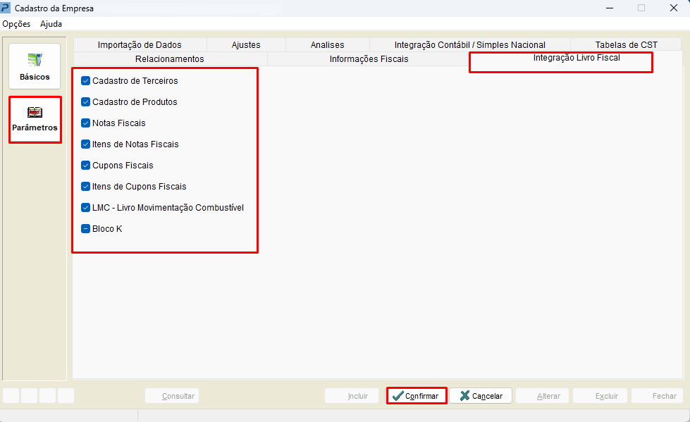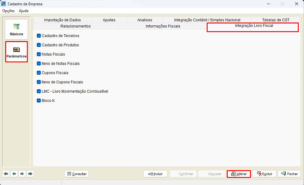 F1199-Parâmetros da guia integração Livro Fiscal do Analisador Fiscal