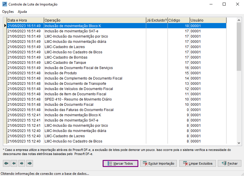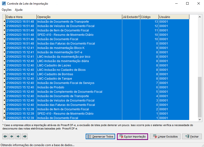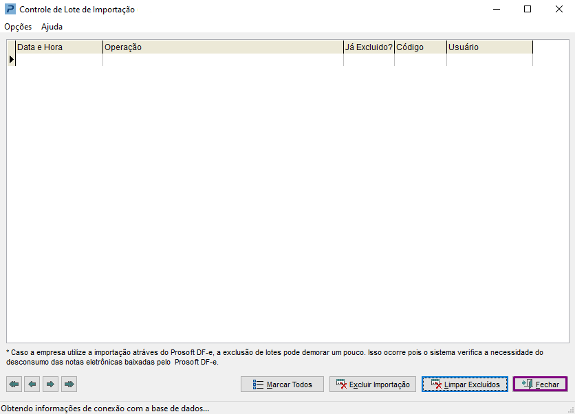 3 - O procedimento da exclusão em lote será o mesmo para o Analisador Fiscal e Importação Segura. Ao selecionar a opção Controle de Lote, irá abrir a tela dos documentos importados.