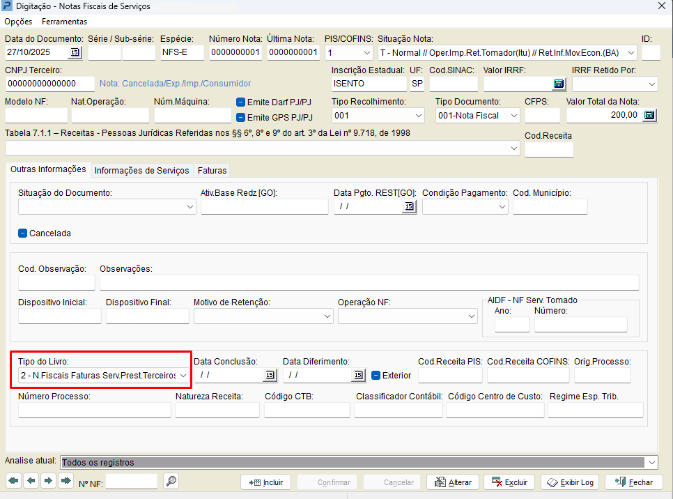 3- Verifique que o campo Tipo do Livro que está com a opção 2 – N. Fiscais Faturas Serv. Prest. Terceiros, clique em Alterar
