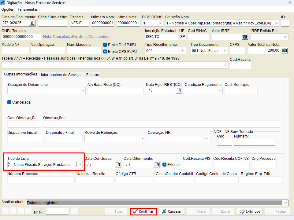 Informações Adicionais: A situação ocorre, pois na análise no campo Tipo do Livro está selecionado modelo incorreto.