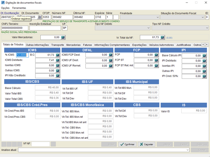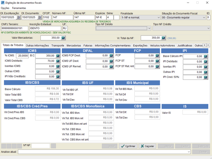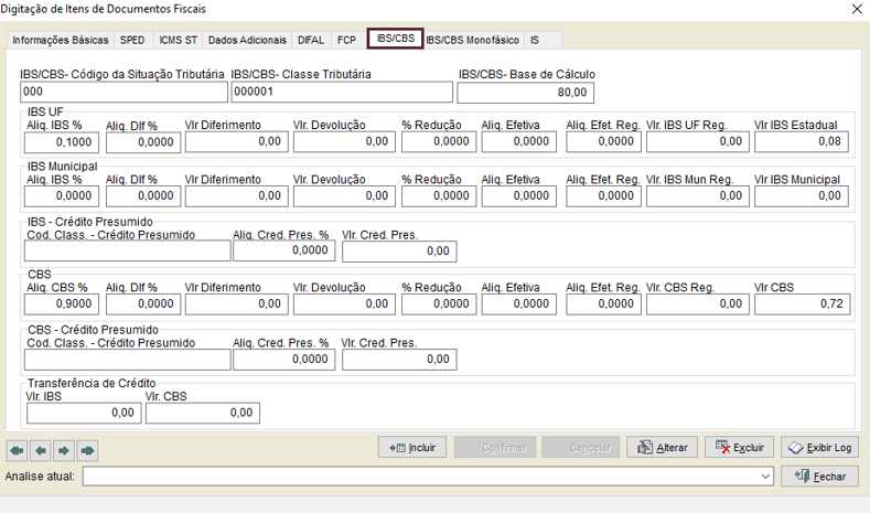 5 - Na Digitação de Itens de Documentos Fiscais, é possível visualizar as novas abas “IBS/CBS”, “IBS/CBS Monofásico” e “IS” com os campos referente aos tributos da Reforma Tributária