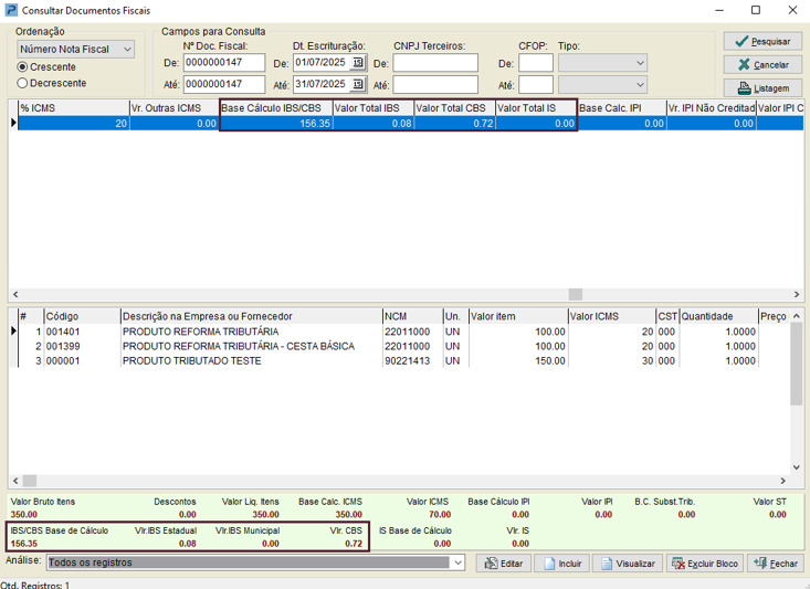 Na consulta de Documentos Fiscais é possível visualizar os valores de IBS/CBS da nota e no rodapé são apresentados os totalizadores referentes aos itens: