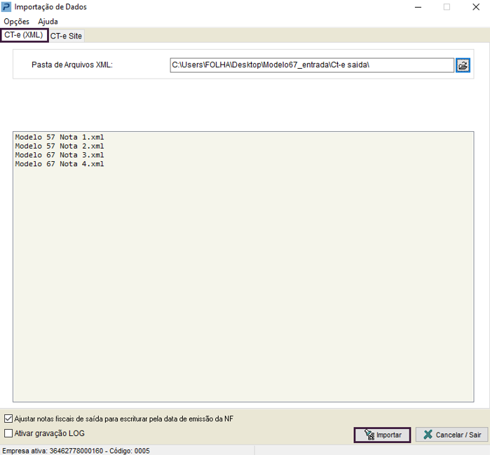 7 - Clique na aba CT-e (XM) e selecione o(s) arquivo(s) xml(s) modelo 57 ou 67 e clique em Importar