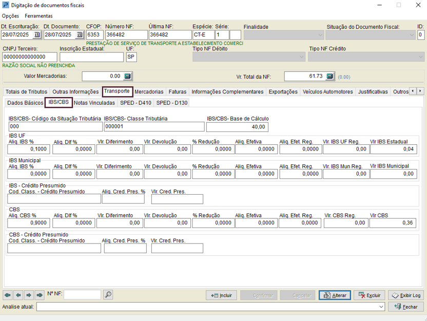 9 - Acesse a aba “Transporte” e a sub-aba “IBS/CBS”, onde os campos referentes aos tributos da Reforma Tributária são apresentados