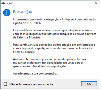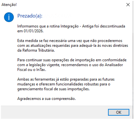 Informações Adicionais: Devido à adequação do sistema às diretrizes da Reforma Tributária, se fez necessária a descontinuidade da rotina Integração – Antiga presente no Analisador Fiscal e Importação Segura.