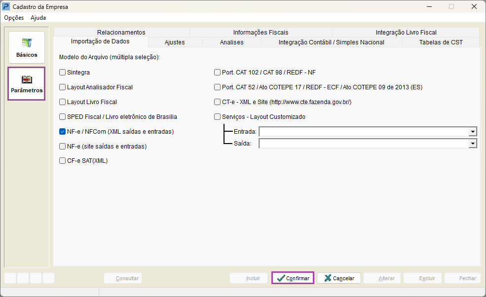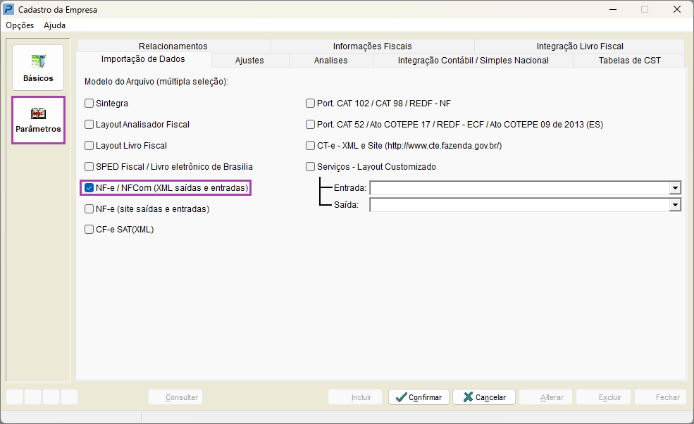 Parâmetros das empresas no Analisador Fiscal e Importação Segura