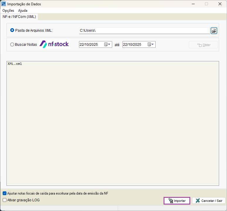 7- Ao acessar a rotina de importação, selecione a aba de importação em XML, busque o arquivo na pasta de destino e clique em Importar.