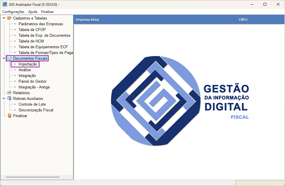 4- Acesse: Gestão da Informação Digital > Analisador Fiscal > Documentos Fiscais > Importação para realizar a importação do arquivo no Analisador Fiscal