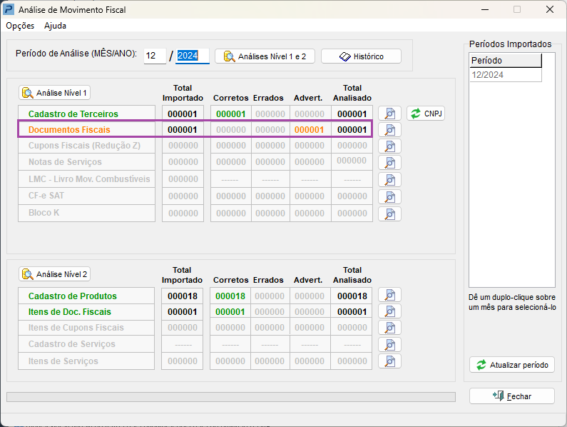 8- Após concluída a importação, as notas poderão ser verificadas na análise, selecionando o período desejado.