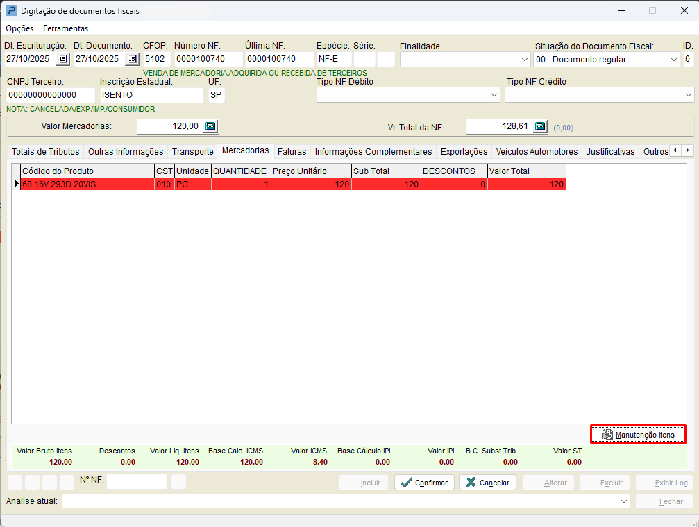 4- Selecione a aba Mercadorias e em seguida, clique na opção Manutenção Itens