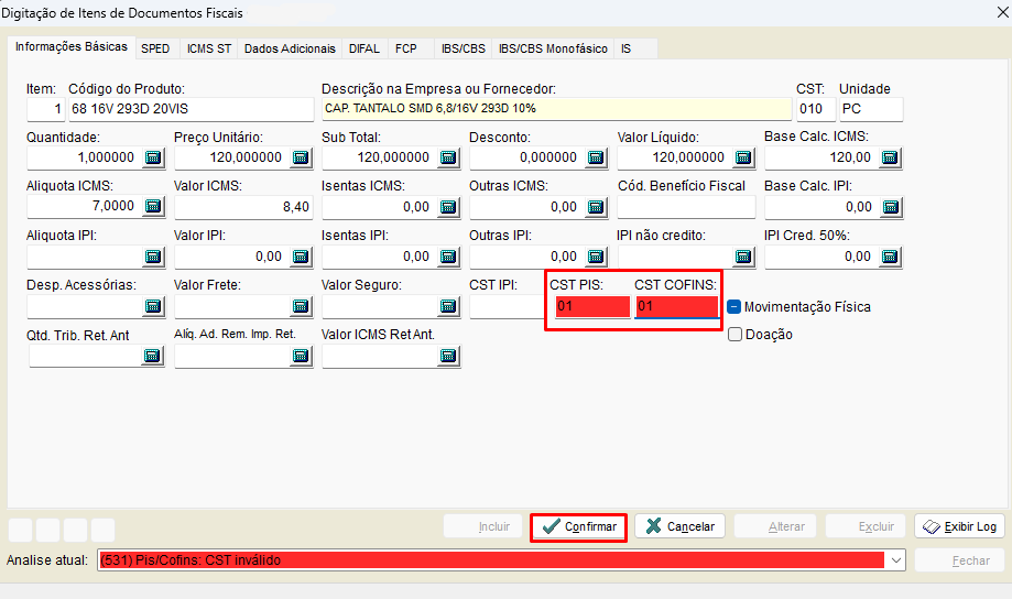 6- Informe o CST correto de PIS/COFINS e clique em confirmar