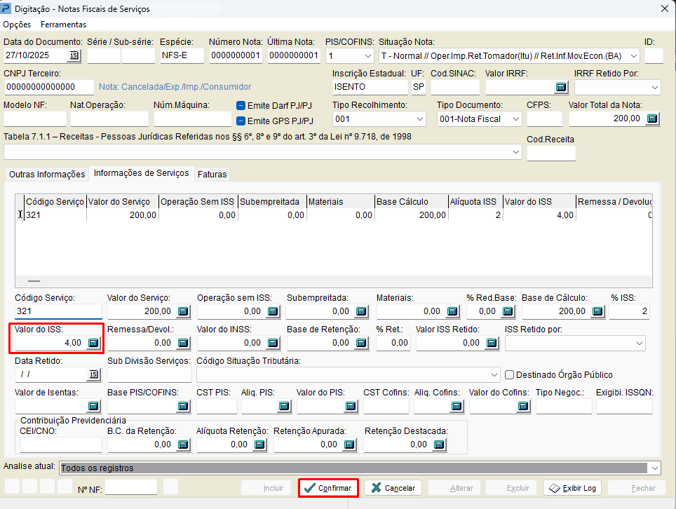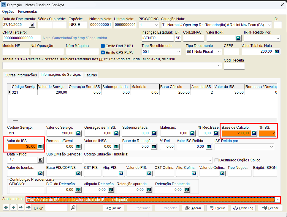 3- Verifique se o campo Valor do ISS coincide com a Base de Cálculo x Alíquota, nesse exemplo o valor de ISS está incorreto