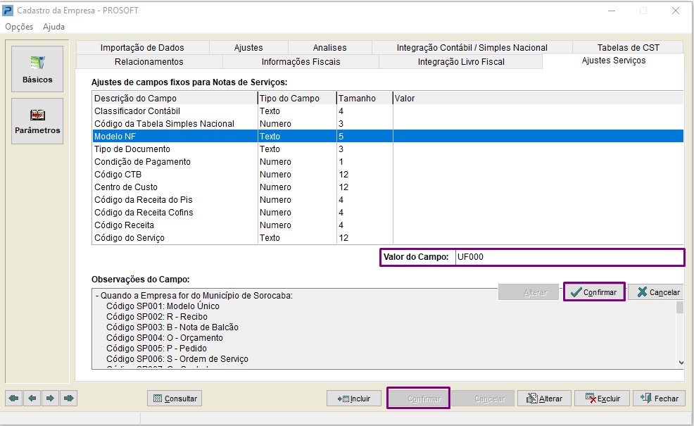 5- Inclua o código no campo Valor do Campo e clique em Confirmar