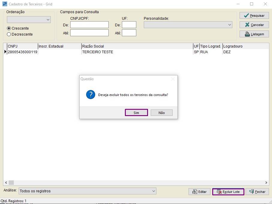 4- Clique em Pesquisar e em seguida clique em Excluir Lote