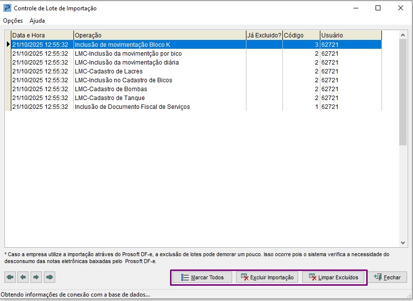 Nota: Caso queria excluir somente a última importação realizada, verifique o dia e horário na coluna Data e Hora e selecione somente os mais recentes.