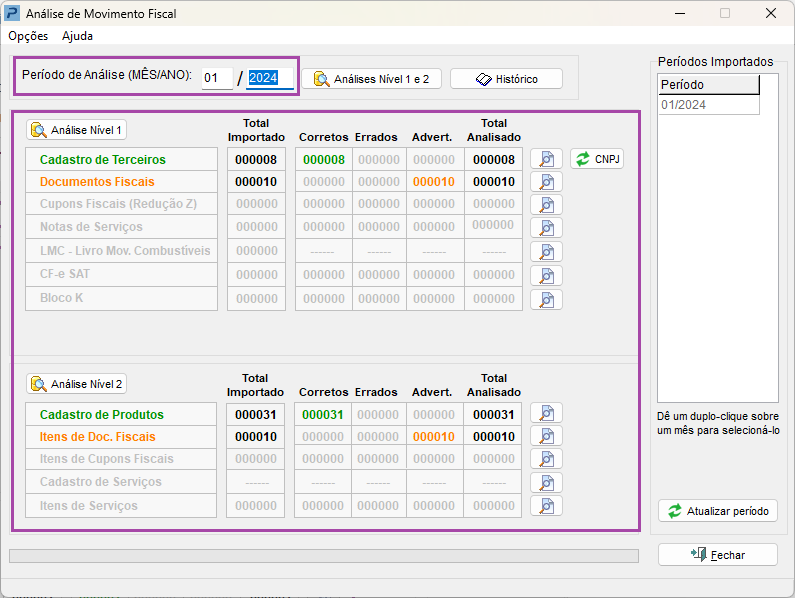 2- Informe o período e processe a análise, não deve apresentar erros no movimento