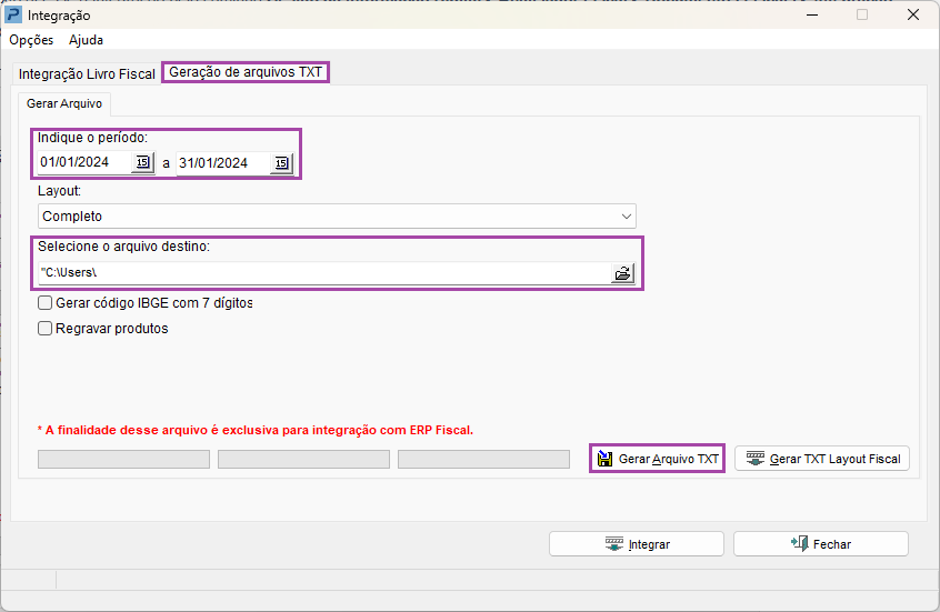 2-Clique na guia Geração de Arquivos TXT
