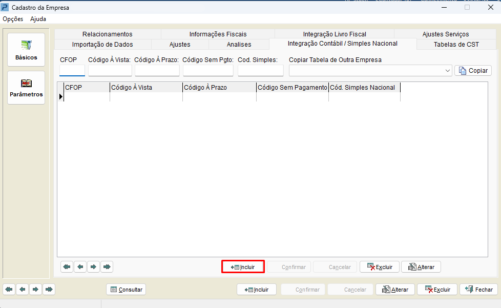 3- No primeiro acesso a rotina não é apresentada nenhuma tabela, pois a mesma ainda não foi incluída para a empresa. Para inserir as informações desejadas para primeira empresa clique no botão Incluir, preencha os campos com os dados correspondentes e então clique no botão Confirmar