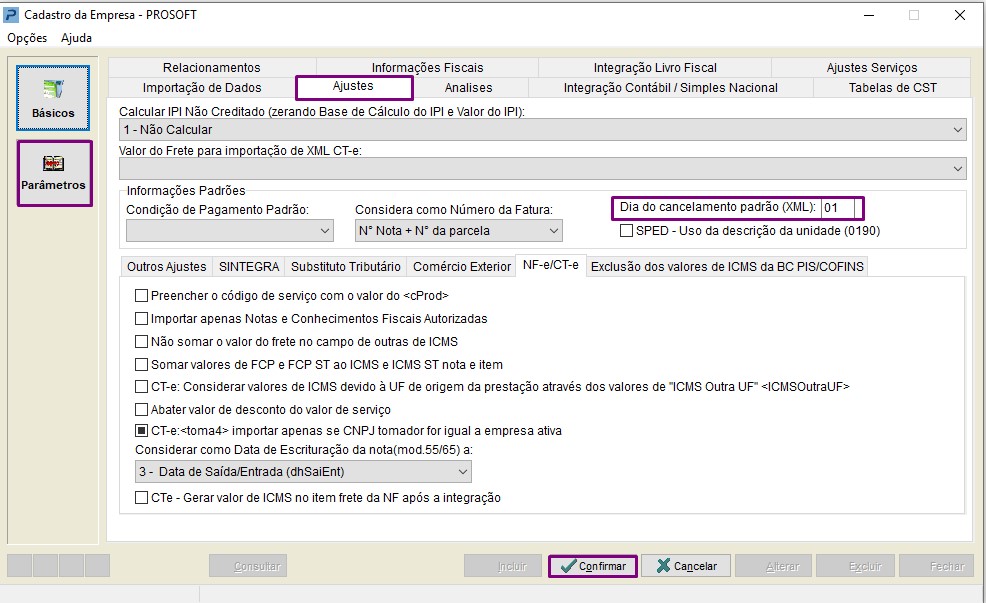 4- No campo Dia do cancelamento padrão (XML) preencha o dia, por exemplo 01 e clique em Confirmar