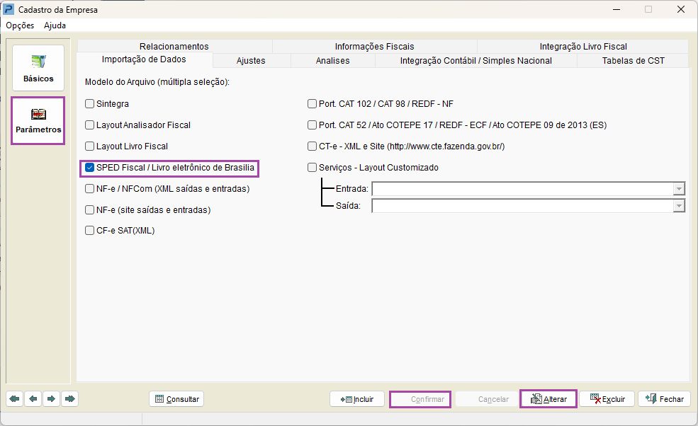 2- Na aba Parâmetros selecione a opção Importação de Dados, clique em Alterar e marque a opção SPED Fiscal / Livro eletrônico de Brasília e clique em Confirmar