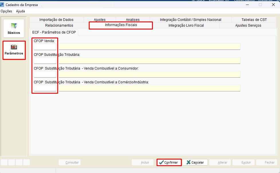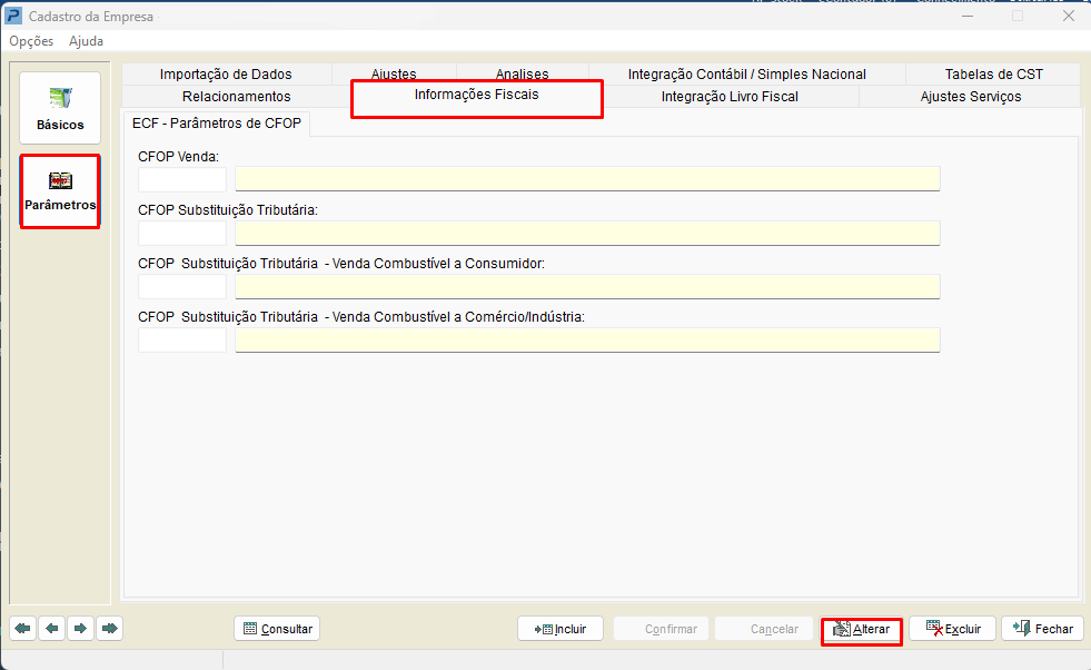 2- Para isso é necessário clique em Alterar, informe os dados de CFOP a ser parametrizado e clique em Confirmar.