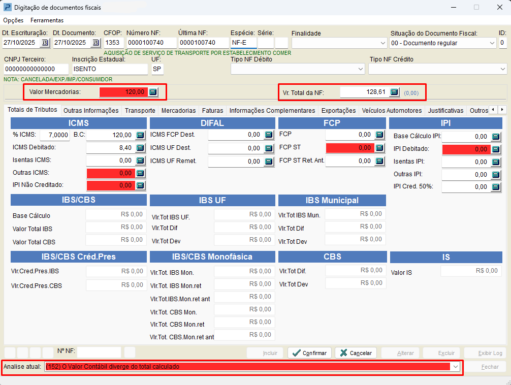 Contexto: Após importar notas pelo analisador fiscal, na analise é apresentado o erro: 152 – O valor total da nota diverge do calculado, como proceder?