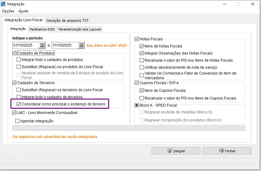Importante: Será assumido os dados de endereço no arquivo SPED Fiscal conforme a Inscrição Estadual ativa na Nota Fiscal na rotina de Escrituração.
