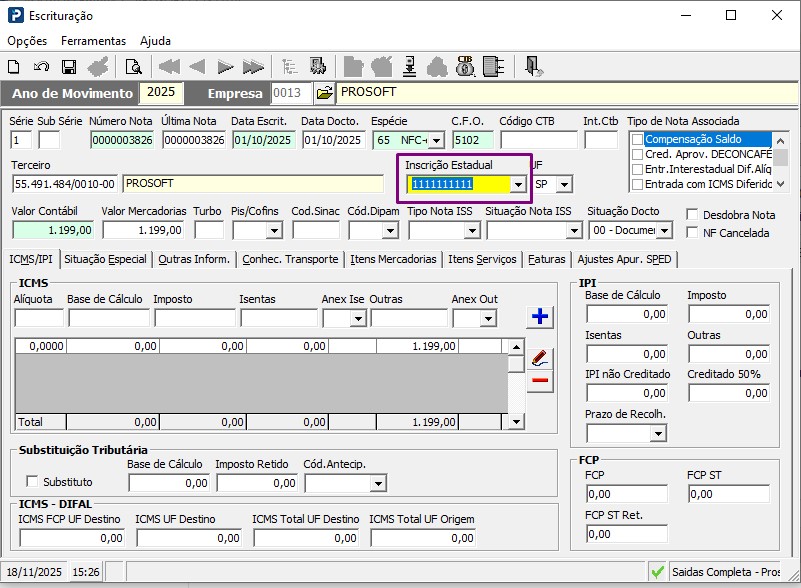 1- Acesse a rotina: Fiscal> Documentos de Entradas e Saídas> Escrituração