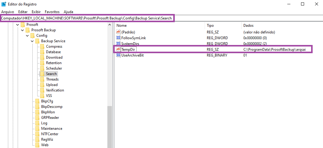 2 - Vá até o diretório HKEY_LOCAL_MACHINE\SOFTWARE \PROSOFT\PROSOFTBACKUP\CONFIG\BACKUP SERVICE\SEARCH e veja o caminho correto em TempDir.
