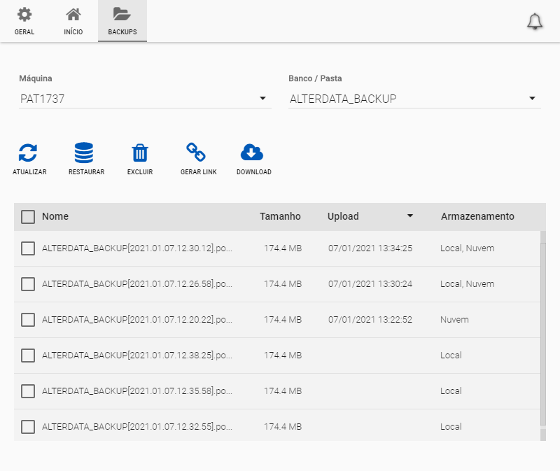 Através da opção “Backups" é possível listar e gerenciar os backups já feitos e armazenados no local e/ou na nuvem.