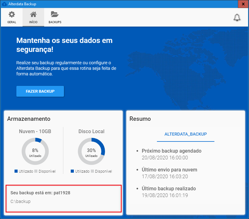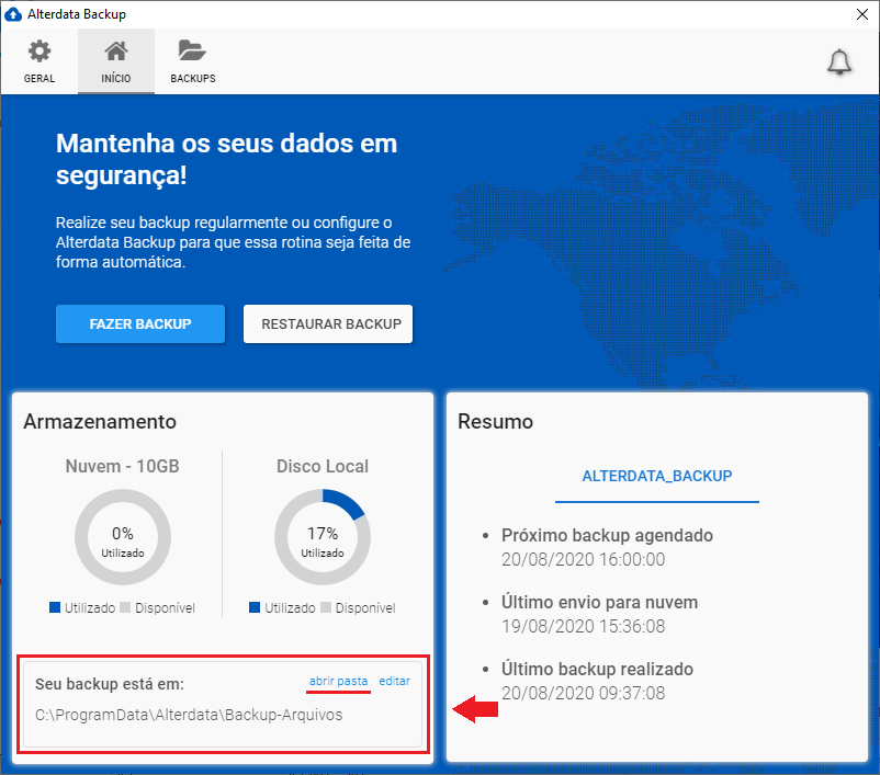 Na ferramenta padrão de Backup dos sistemas, quando configuramos um diretório de Backup, o arquivo é gerado diretamente neste local configurado.  O Alterdata Backup funciona de uma forma um pouco diferente: