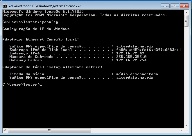 3) Para descobri o ip na tela do CMD digite : "ipconfig" e pressione Enter. Será apresentado o IP do Computador.