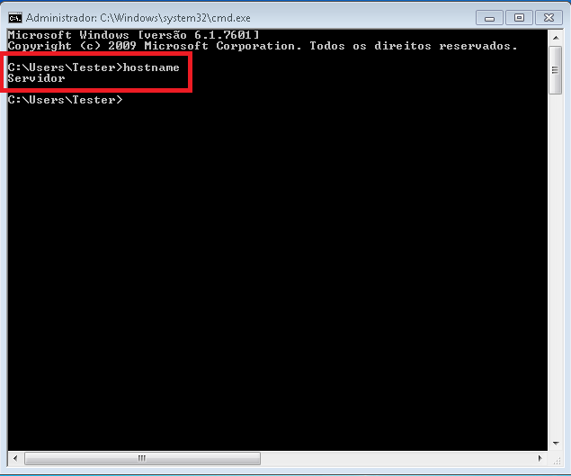 2) Quando o CMD estiver aberto digite "hostname" e pressione Enter. Será apresentado o Nome do computador: