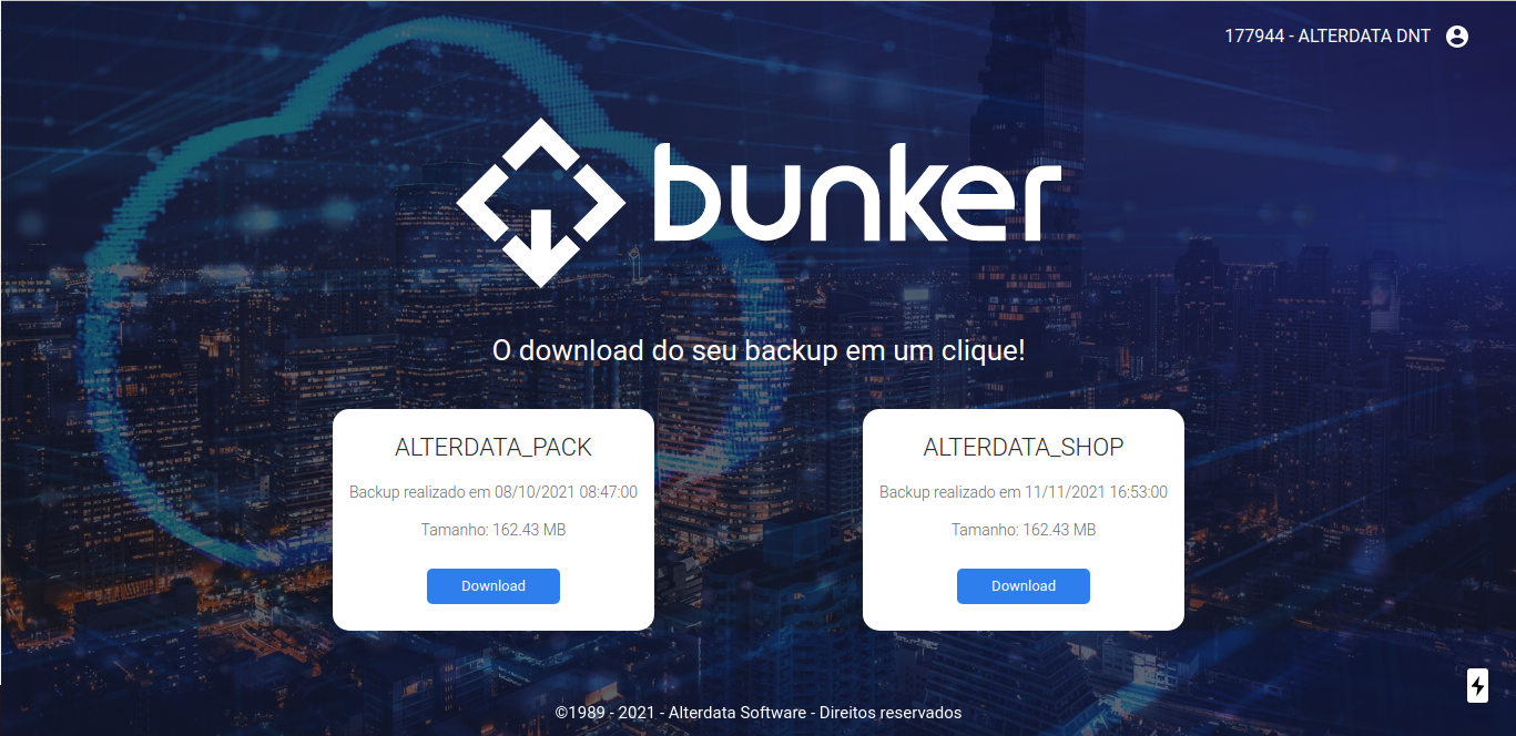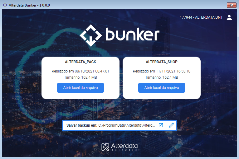 Antes de tudo, vamos separar o arquivo de backup que será restaurado. Para tanto baixe seu backup em: https://bunker.alterdata.com.br ou o localize pelo Bunker instalado em seu computador clicando em "Abrir Local do arquivo".