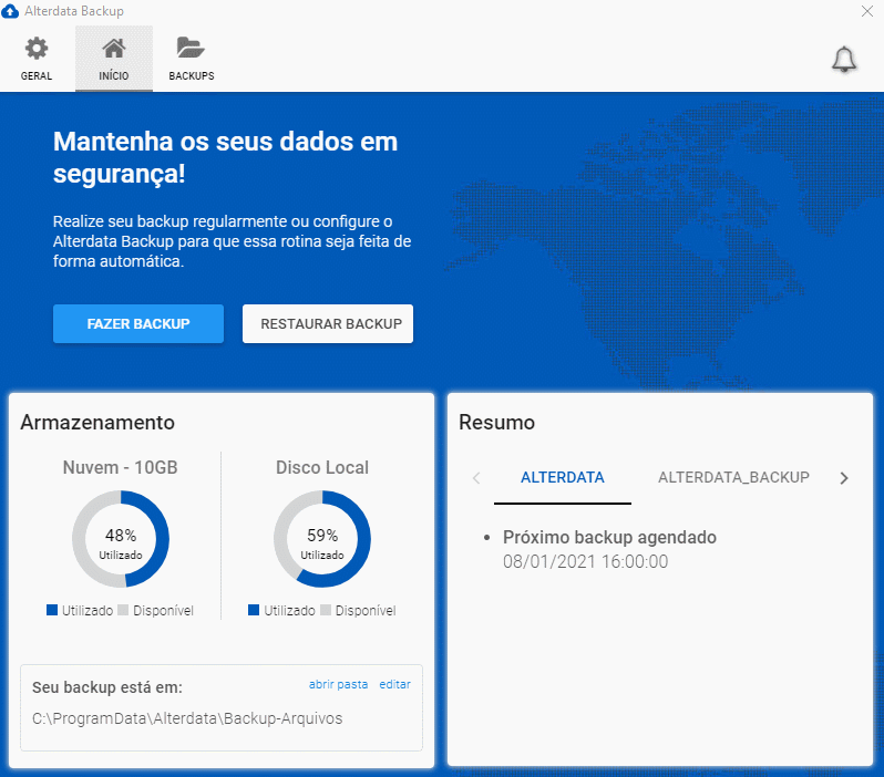 Desta forma por qualquer computador que tenha o Alterdata Backup, podemos ver todos os backups feitos e na coluna "Armazenamento" ver seu status ('Local', 'Nuvem' ou 'Local, Nuvem').