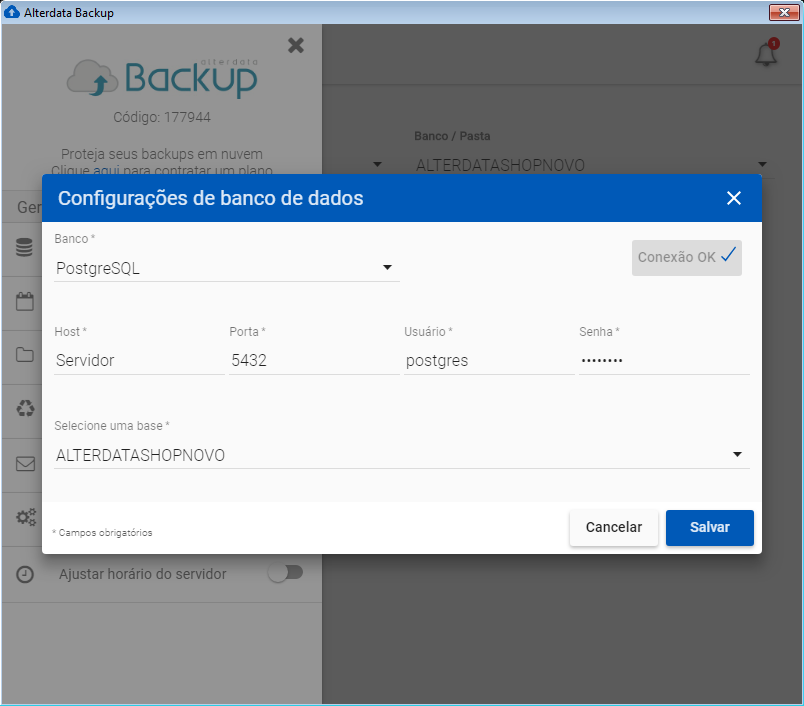 Lembrando que as configurações de banco de dados são enviadas automaticamente ao abrir o Alterdata Backup.