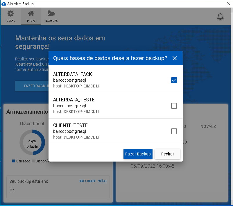 Caso um cliente tenha mais de uma base registrada e seja necessário fazer um backup imediato, ao clicar em "Fazer Backup" será exibida uma lista de bases para o usuário escolher qual base ele deseja fazer o backup.
