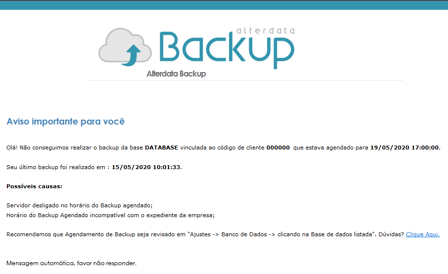 No e-mail também avisamos o dia e hora do último backup que foi feito para que você fique sempre bem informado.