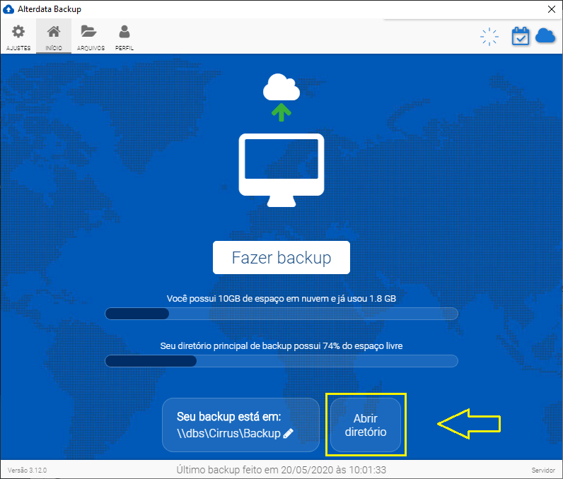 "Abrir diretório" na tela inicial do Alterdata Backup
