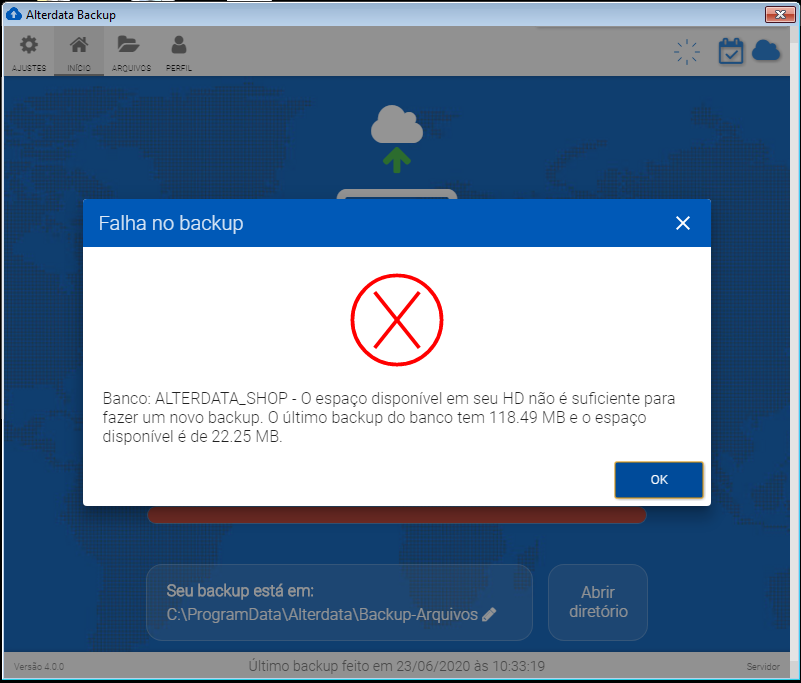 Então, caso a rotina de backup seja iniciada e não haja espaço suficiente para gerar o arquivo de backup no disco local. O sistema apresentará mensagem informando que não há espaço suficiente para fazer um backup. Caso seja um backup automático o cliente receberá notificação de erro no backup.