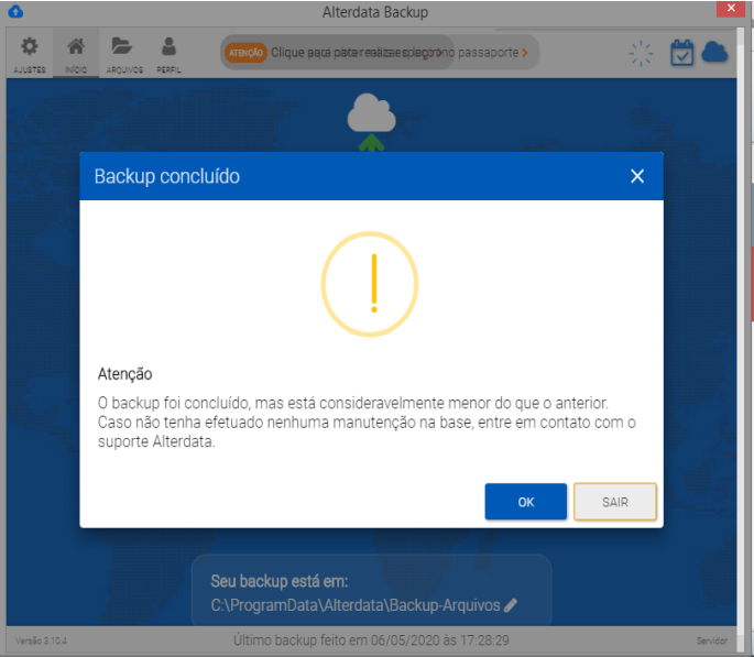Para mantê-lo sempre informado do que está acontecendo com seus backup's incluímos uma mensagem na tela do sistema avisando quando o backup realizado for menor que o anterior. Também será disparado um e-mail avisando-o sobre esta situação.