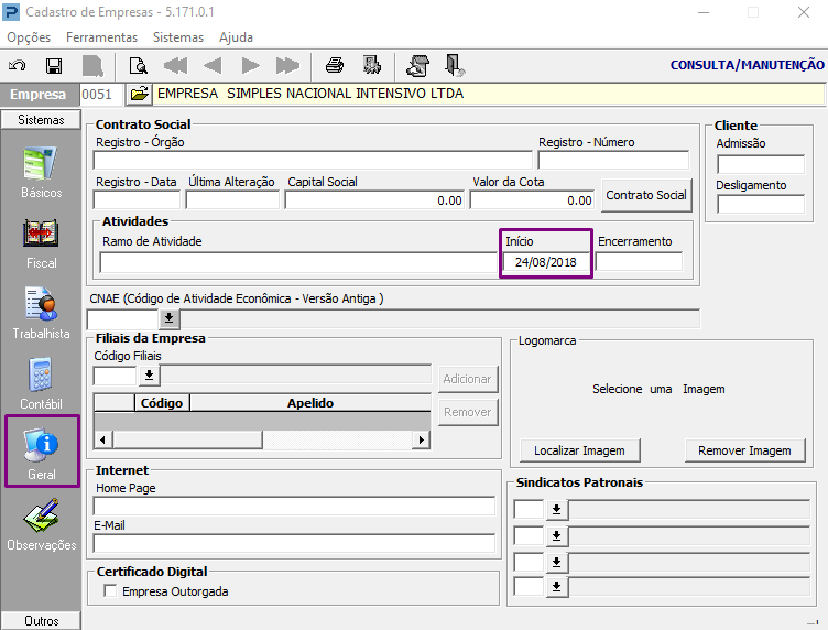 2- Na guia Geral, informe a data de Início das Atividades da Empresa.