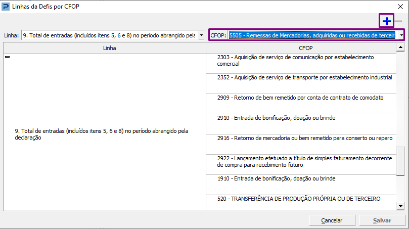 Ao selecionar o CFOP, será habilitado o botão “+” para “Adicionar” o CFOP na lista da linha.