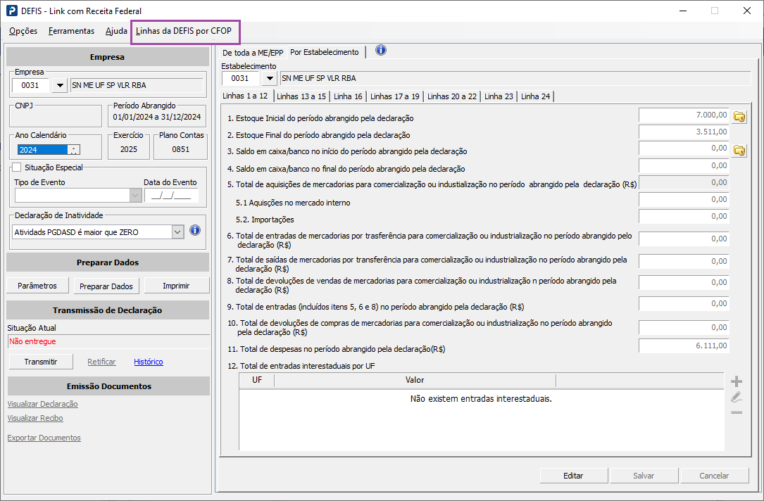 Ao executar a rotina, é possível observar na barra de menu, a opção “Linhas da DEFIS por CFOP”. Esta opção não está vinculada a uma empresa, uma vez que o CFOP não precisa de vínculo à uma empresa.