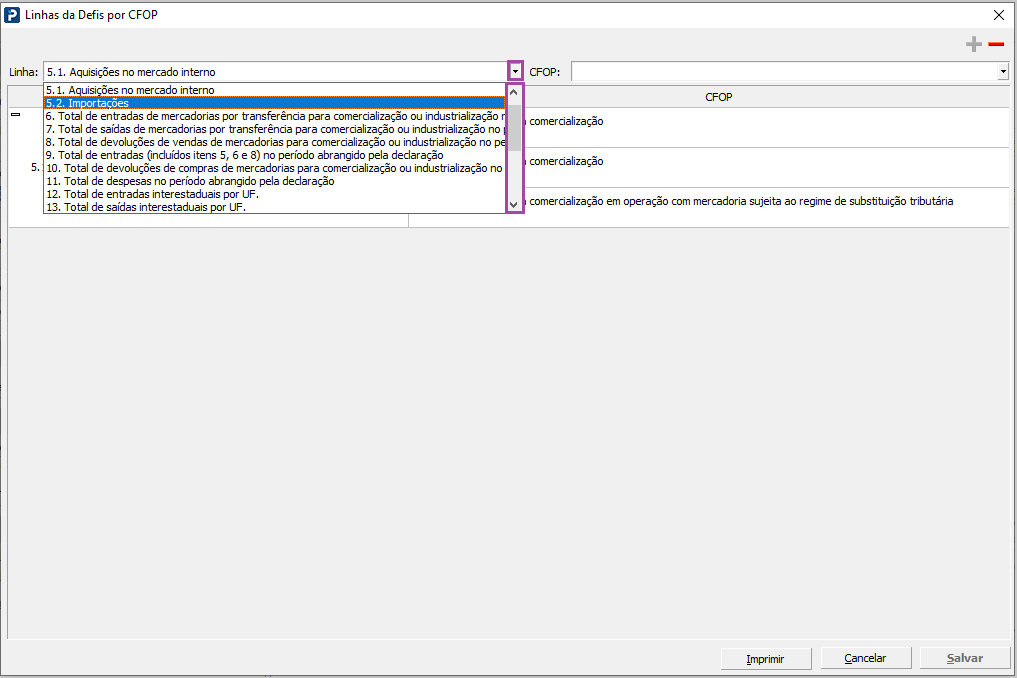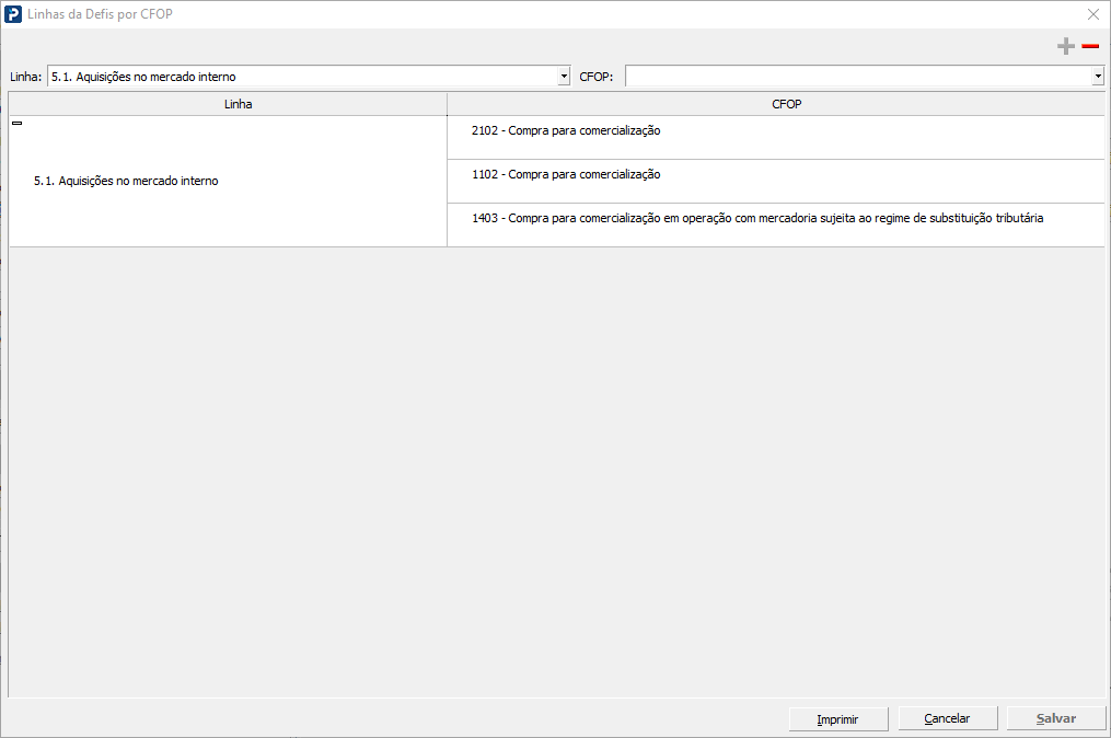 Ao selecionar o(s) CFOP(s), será habilitado o botão “-” para “Remover” o CFOP na lista da linha.