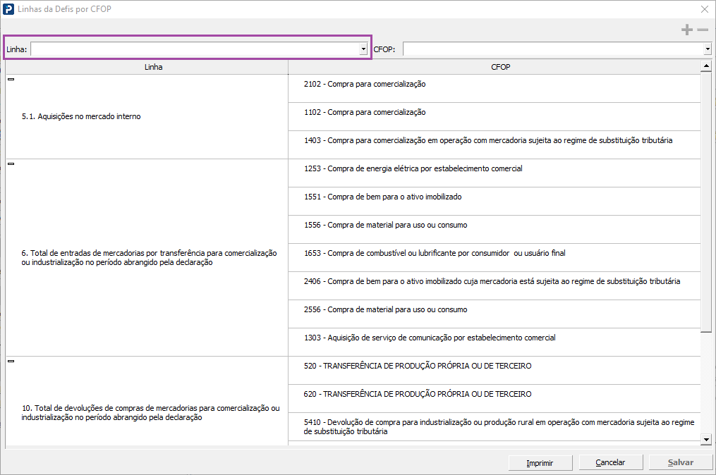Para desvincular uma “Linha” a um “CFOP”, clique no combo “Linha” e selecione a linha desejada e em seguida, selecione na grade, o(s) CFOP(s) que deseja remover.