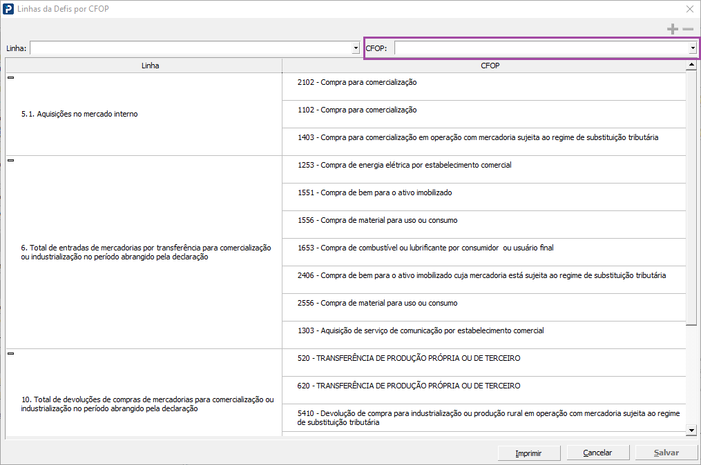 CFOP: este campo permite a visualização e seleção dos CFOPs existentes na tabela de CFOPs, conforme tabela padrão da RFB, para relacionamento com a linha selecionada.